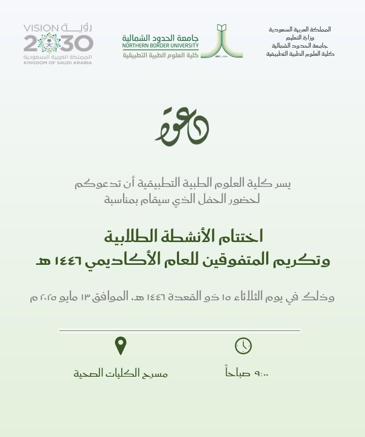 تدعوكم كلية العلوم الطبية التطبيقية لحضور حفل ختام الأنشطة وتكريم المتفوقين في مسرح الكليات الصحية بقسم الطلاب يوم الثلاثاء ١٥ ذو القعدة ١٤٤٦هـ الموافق ١٣ مايو ٢٠٢٥م في تمام الساعة ٩ صباحا